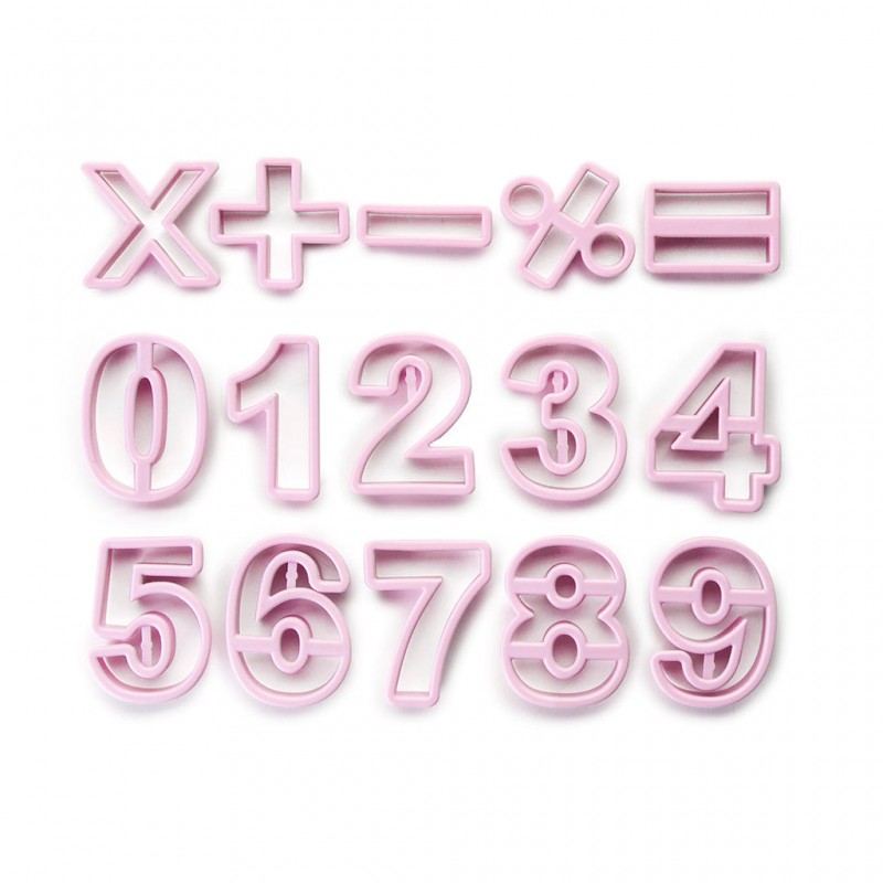 Cortador de galletas IBILI. Este es un set de 15 cortadores de galletas que contiene todos los números incluyendo el 0, ademas de el signo de mas (+), menos (-), por (x), igual (=) y pocentaje (%): Estan fabricados en plástico y son muy practicas de usar y faciles de lavar. Con este set podrás decorar pasteles, galletas,fondant.