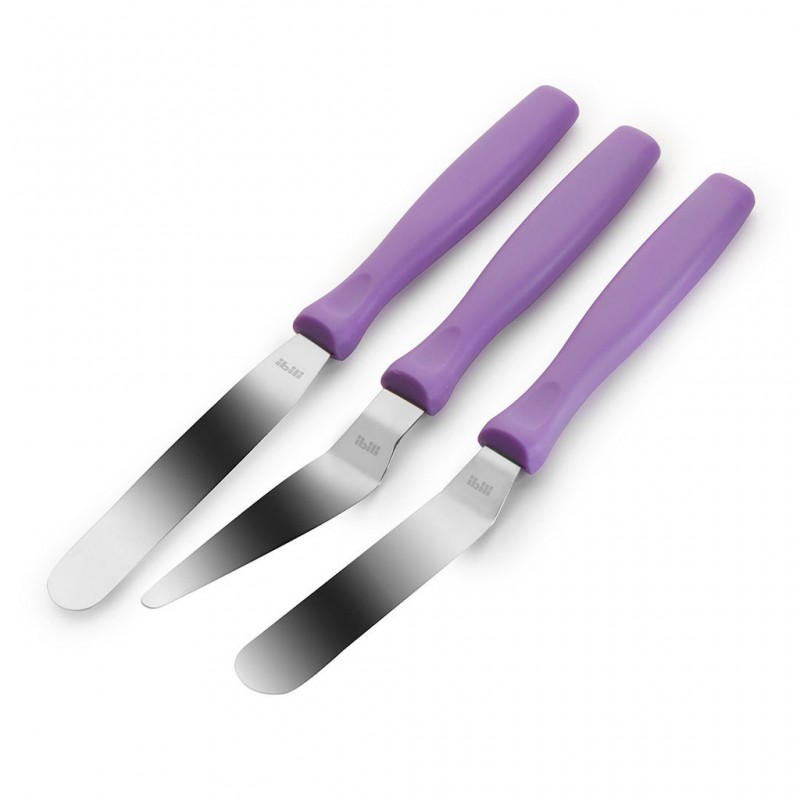 El juego es de 3 espátulas, una espátula recta, una espátula acodada y una espátula triangular. Las tres espátulas son de acero inoxidable 18/10, y el mango de plástico muy resistente, color morado.